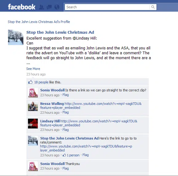 The other thing John Lewis has done well is to contain the issue on the channels where the comments are appearing, rather than over-reacting. It is responding to Facebook campaigners on Facebook; it hasn’t contributed to the issue by posting statements everywhere and giving the issue more publicity. [This has rather changed since the time of writing. There appear to be mixed messages among campaigners about whether John Lewis has listened to criticism or not, and whether that crticism has contributed to the ad being changed. Perhaps decisive action earlier on would have prevented today’s publicity achieved by campaigners around the ad].