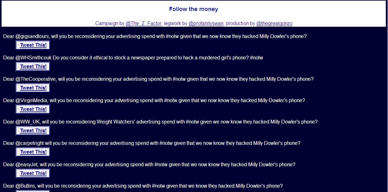 I don’t think I’ve ever seen a mass brand attack like this one, and on so many brands who are clearly not prepared to deal with it. They have been caught in the crossfire of a scandal totally outside of their control, but suddenly have enormous power to influence NOTW. I’m sure there are furious discussions underway within each to decide the appropriate response. I’m also sure that each brand will be evaluating how it manages its Twitter feed during a situation like this.